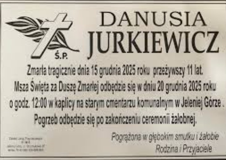 Msza święta żałobna za duszę Danusi odbędzie się w sobotę, 20 grudnia, o godz. 12:00 w kaplicy na Starym Cmentarzu Komunalnym w Jeleniej Górze. Pogrzeb nastąpi bezpośrednio po jej zakończeniu.